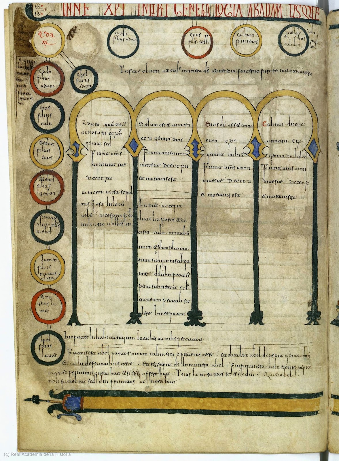 The above figure is the first page from the Roda Codex, in the Real Academia de la Historia (Madrid) cod.78 (dated 990 AD). This is the start of the genealogy, with Adam at the top-left, and illustrating his family.