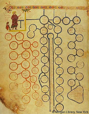 Given the importance of the New Testament genealogies for the foundation of Christianity (see The role of biblical genealogies in phylogenetics), it is not at all surprising that eventually someone had a go at summarizing them all in one place. However, this did not happen until several centuries later, when the Bible was being translated into Latin. Perhaps this delay had something to do with the biblical prohibition on images.