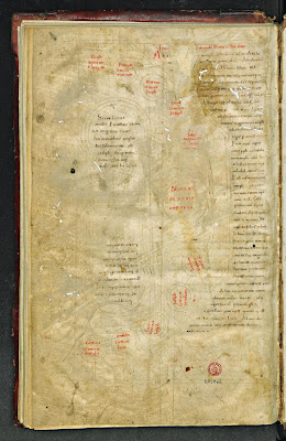 Piggin reconstructs the document (shown above), which he calls the Great Stemma, as a single scroll made from papyrus, designed to be unrolled and read from the upper left towards the middle right. All extant copies, however, break the figure up into sections, for inclusion as pages in a parchment manuscript (a codex) typical of the Medieval period.