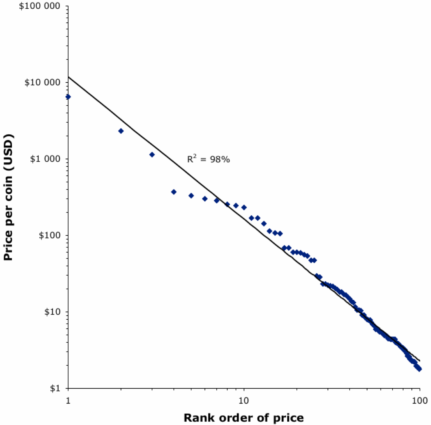 These 25 coins also fit Zipf's Law very well, but the power exponent is clearly smaller than for the remaining coins. In this case, Bitcoin fits the Power Law even better than before. Like it or not, relative to the other coins, Bitcoin is, indeed, not "too expensive".
