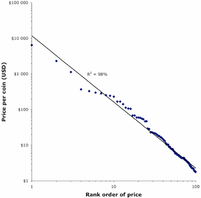 Mathematically, Power Laws are of interest because of what is known as "scale invariance", as well as the fact that there is no well-defined average value. Furthermore, Power Laws are considered to be universal — you can read about this in Wikipedia. One of the more obvious places that we might expect to find them is in the exchange rates of currencies (their "worth") — there will be a few of great worth (the "major currencies") and lots of lesser worth.