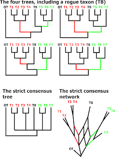 - Putting up a morphological matrix, then inferring the tree. A classic but due to the nature of most morphological data sets leading to a partly wrong tree as we demonstrated in some posts here on the Genealogical World of Phylogenetic Networks (hence, such analysis should always be done in a network-based exploratory data analysis framework).