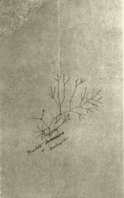 This sketch is one that will look vaguely familiar to anyone who has read The Origin of Species. It appears between pages 26R & 26S of Darwin's draft book on Natural Selection (sometimes referred to as his Big Species Book). This was the book originally intended to introduce Darwin's ideas to the world (written from 1856-1858), but which he had to abandon once he realized that Alfred Wallace had independently deveoped the same general ideas.