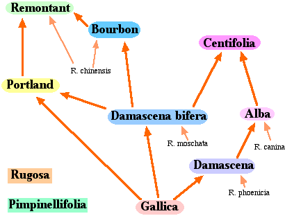 This first one is a biological example, taken from the web page of Sparlösa Trädgård, a well-known Swedish garden. I interpret this as a hybridization network. It shows part of the history of rose cultivars (in the genus Rosa), with the arrows indicating the origin of most of the different types that one encounters in gardens today. The history is quite accurate, although no specific dates of origin are given; and a more detailed word description can be found at the web page of Kew Botanic Gardens.
