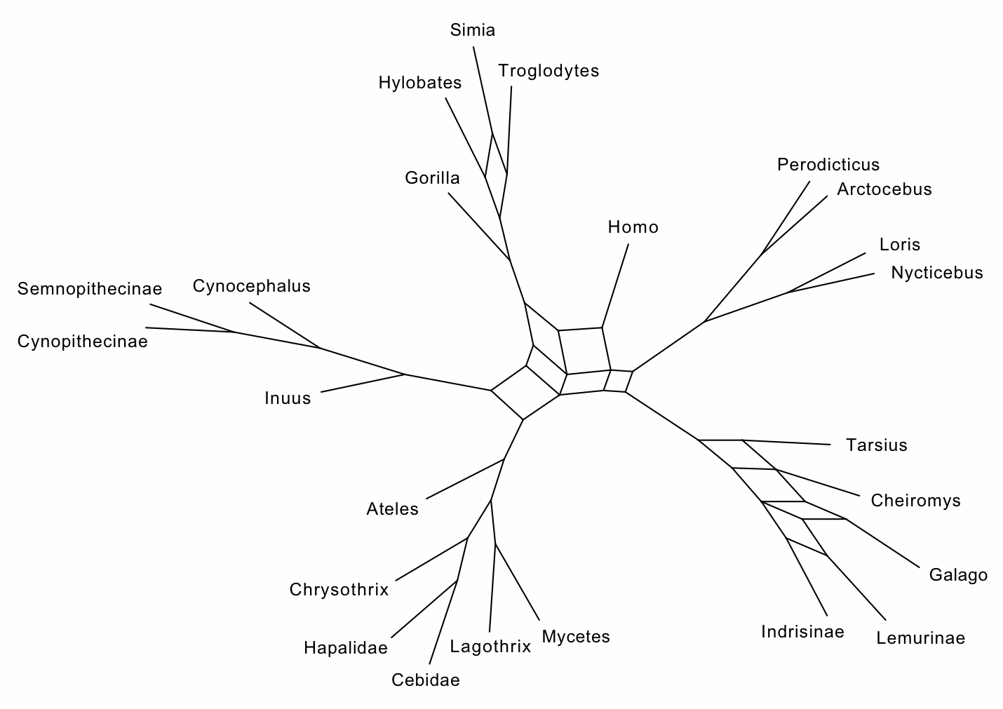 Here, I have produced a network based on Mivart's 1865 and 1867 trees. There are 24 taxa of Primates, although the Gorilla was not in the 1865 dataset, and Inuus, Cynocephalus, Chrysothrix were not in the 1867 dataset. From these two trees I have produced a SuperNetwork, using the SplitsTree program. This is thus a splits graph, interpreted in the usual manner, so that the reticulated parts represent conflict between the two trees and the non-reticulated parts represent agreement.