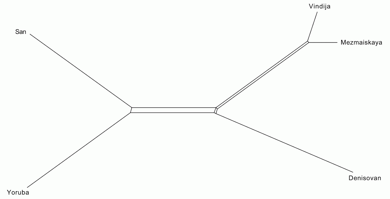 | Figure 1. NeighborNet analysis of the autosomal DNA sequence divergences for two modern humans (San, Yoruba), two fossil Neandertals (Mezmaiskaya, Vindija), and a fossil Denisovan. |
