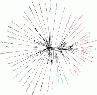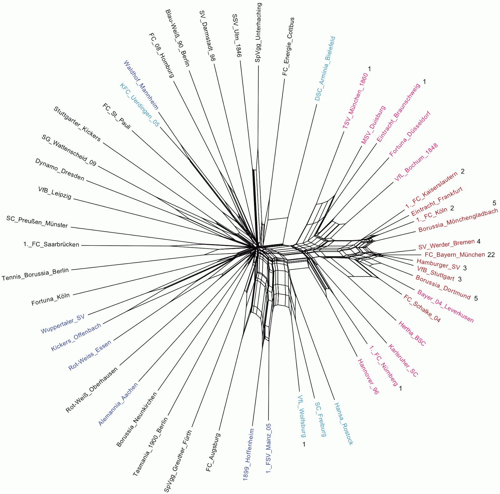 This phylogenetic network thus provides a very effective visual summary of the main features of the 1.Bundesliga results when averaged over all of the 50 seasons.
