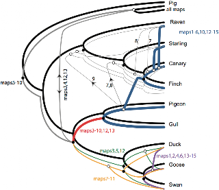 Mike Steel once very usefully asked me, what are the desired properties of cophylogeny maps? In trying my best to answer him I realised that none of the properties really needs either phylogeny to be a tree. Nodes in P are mapped to nodes or edges in H, and the evolutionary history they imply is based on the route through H from parent node p' to child node p in P. If H is a tree then this is unique; otherwise there can be ambiguity and a potential explosion in number of solutions. But it does mean that potentially we can solve the mapping problem moderately well so long as P and H are at least DAGs. While this is possible in principle, in practice, it's pretty much impossible.
