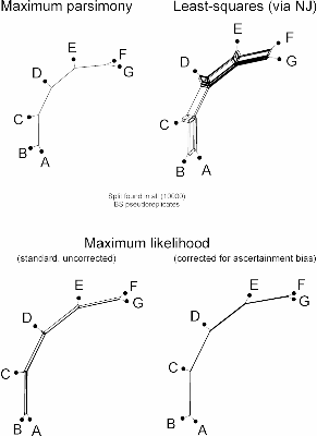Using all of the variable characters, NJ and ML are generally more decisive and produce higher support for the right branches. But for the dichotomous evolution scenario, they also show ghost-clades ("para-clades" as they include close relatives sharing a recent common origin, but do not represent monophyletic groups sensu Hennig) with low support. The corresponding MPT has no ghost-clades, but it also provides no clues to how B,C,D and E,F,G are related to each other.
