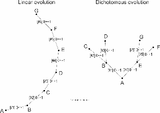 Two trivial scenarios: a linear and a dichotomous evolutionary sequence