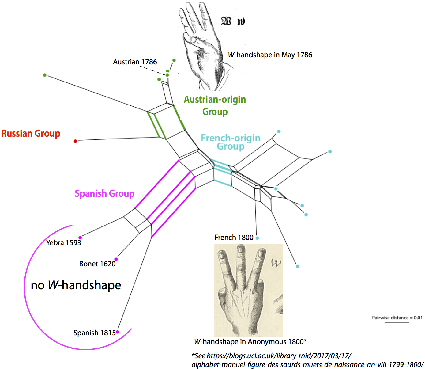 The two earliest manual alphabets in our dataset were published in Madrid in 1593 (de Yebra) and 1620 (Bonet). In neither case do we see any trace of a hand-shape representing the letter "W", which was not needed to represent these Latin alphabets. Later, too, manual alphabets published in Spain in 1815, 1845, and 1859 still did not include the letter "W". In contrast, in Austrian 1786 and French 1800 (as well as other languages), hand-shape forms representing the letter W are found in the earliest examples we have for those languages. Some 160–230 years later, however, we find similar forms for "W" in contemporary Austrian, French and Spanish SLs. We deduce that contemporary Spanish SL did not inherit the "W" hand-shape from the 19th century Spanish manual alphabets. Instead, the hand-shape may have been borrowed from some other language, possibly French SL given its influence on deaf education in Europe, or possibly later from the International Sign manual alphabet (also part of the French-origin Group).